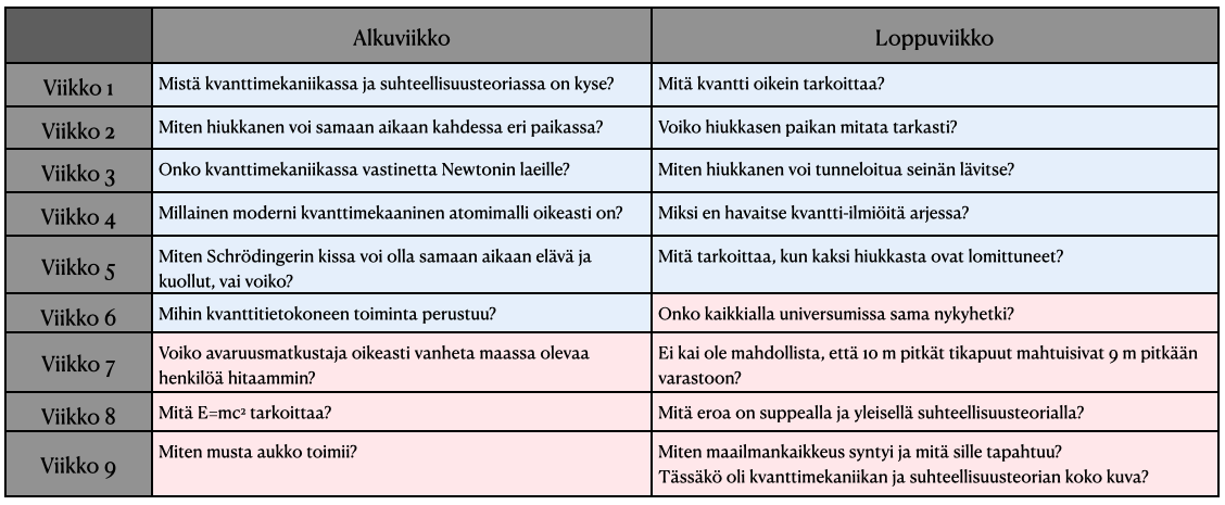 Kurssi pohjautuu yleistajuisiin ja kiinnostaviin kysymyksiin. Kysymykset jakautuvat johdanto- ja yhteenvetokysymyksiin (valikon vihreät puhekuplat), kvanttimekaniikan kysymyksiin (siniset puhekuplat) ja suhteellisuusteorian kysymyksiin (punaiset puhekuplat). Voit johdantokysymyksen jälkeen valita aloituksen joko kvanttimekaniikan tai suhteellisuusteorian kysymyksistä, mutta molempien aiheiden sisällä kysymykset kannattaa käydä läpi esitetyssä järjestyksessä. Käy päätöskysymys läpi vasta lopuksi.