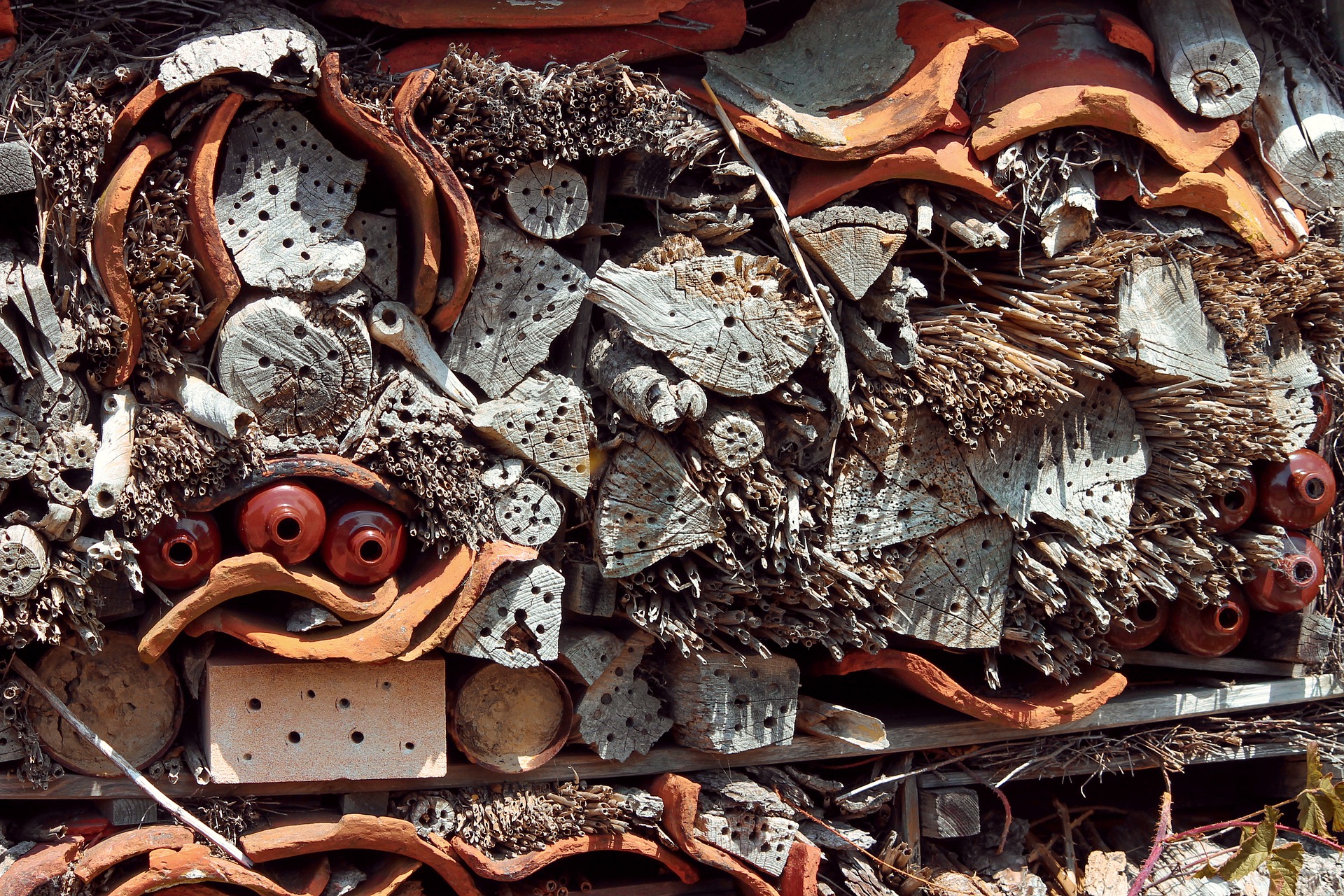 Image. A close-up of an insect hotel. A wall-like insect hotel has been built from pieces of pots and natural materials such as pieces of wood with holes made to them. (Image by Manfred Richter from Pixabay. Free to use under the Pixabay License.)