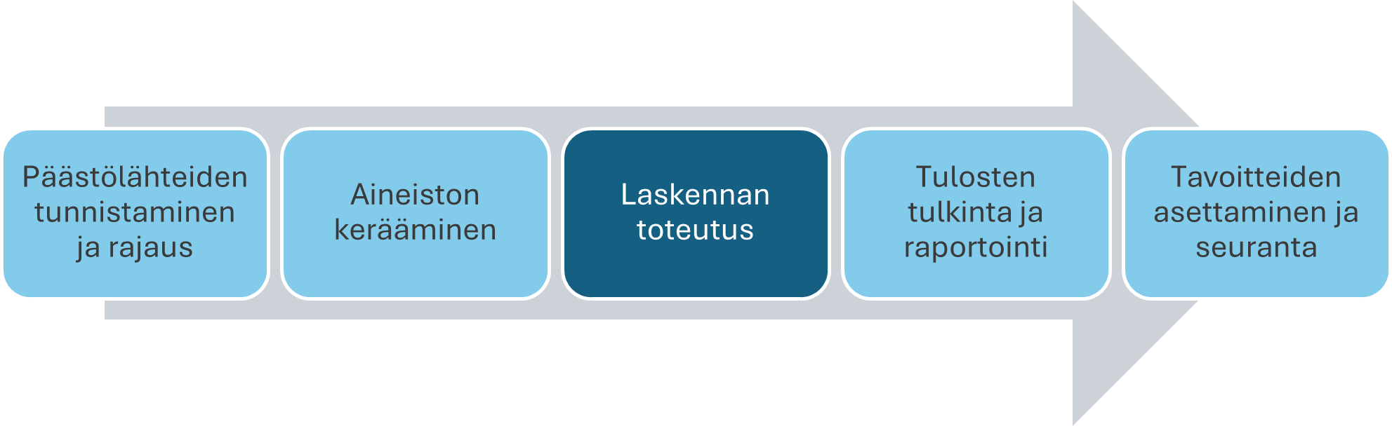 Varsinaiseen hiilijalanjäljen laskennan toteuttamiseen on olemassa monenlaisia ratkaisuvaihtoehtoja ja työkaluja. Valittu lähestymistapa voi vaikuttaa tarvittavaan aineistoon ja sen keräämiseen, joten laskentaprosessin toinen ja kolmas vaihe kulkevat oikeastaan rinnakkain.
