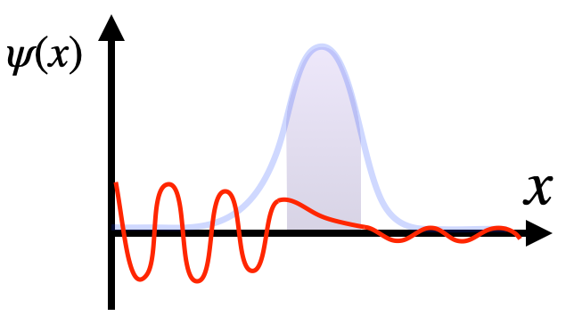 Aivan niin. Mutta kun tilannetta tarkastellaan kvanttimekaanisesti, hiukkanen voi kuin voikin päästä nyppylän ohi. Alla olevassa kuvassa on esimerkki hiukkasen aaltofunktiosta tällaisessa tilanteessa. Hiukkasen tulosuunnassa vasemmalla aaltofunktiolla on suuri amplitudi, joka pienenee klassisesti kielletyllä alueella, mutta säilyy nollasta poikkeavana myös nyppylän oikealla puolella: hiukkasella on todennäköisyystiheyttä myös nyppylän oikealla puolella. Siten hiukkanen on mahdollista havaita myös potentiaalivallin toisella puolella, vaikka vallin korkeus onkin hiukkasen liike-energiaa suurempi. Jos havaitaan mitataan vallin oikealla puolella, sanotaan, että hiukkanen on tunneloitunut potentiaalivallin läpi.