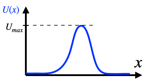 Jatketaan niistä lähtökohdista, joihin päädyimme kysymyksessä Onko kvanttimekaniikassa vastinetta Newtonin laeille? Olkoon potentiaalienergia kuten alla kuvassa 1, eli potentiaalienergia on nolla ottamatta lukuun pientä U_{max}:n korkuista mäennyppylää.